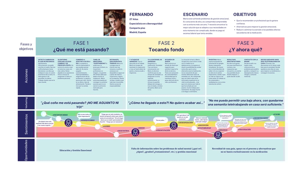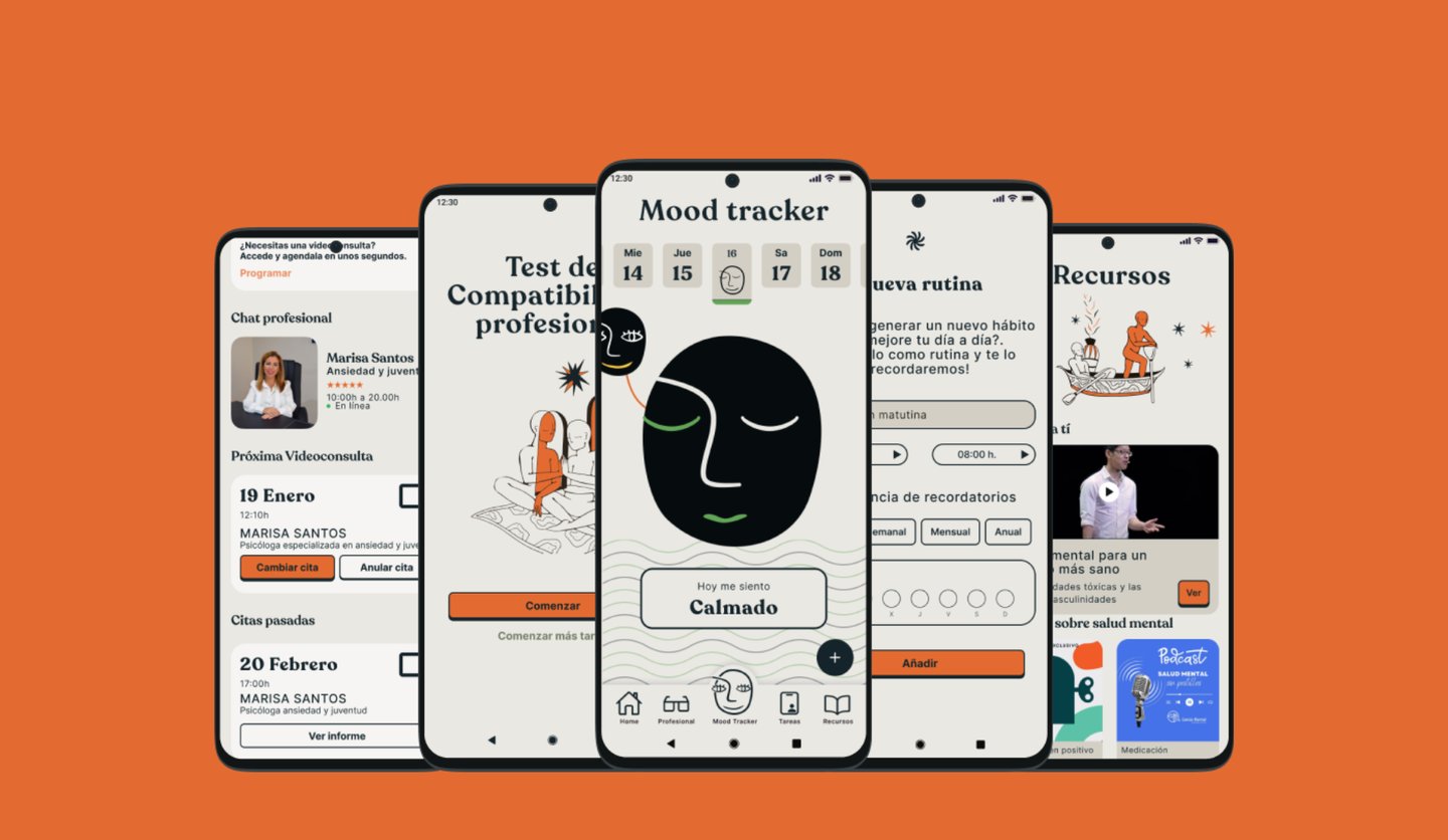 Para ello realizamos un Desk Research en el que concluímos que los problemas de salud mental más comúnes son la ansiedad y la depresión y que su aumento exporencial entre la población y, en especial, la población joven, se produce a raíz del estrés post pandémico de la Pandemia del COVID-19, un ritmo de vida acelerado, y las falsas expectativas que se promueven a través de las Redes Sociales. Asi mismo, descubrimos que el entorno condiciona mucho la salud mental.