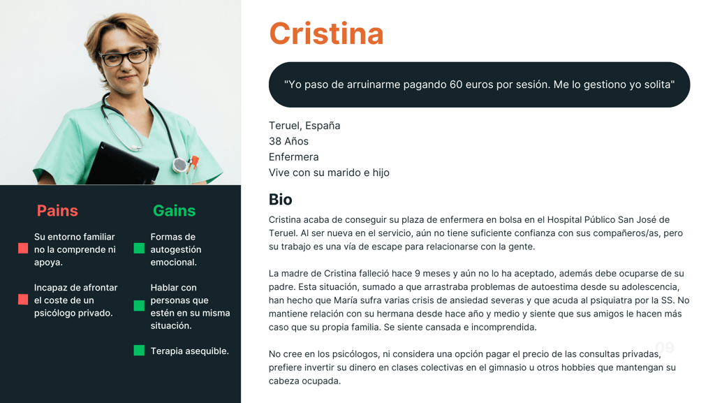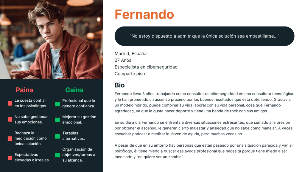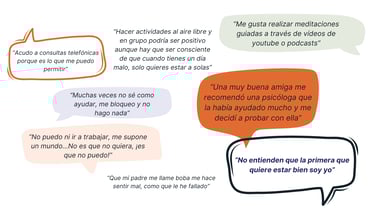 A pesar de haber obtenido un conocimiento muy valioso sobre el contexto y causas de una mala salud mental en España, necesitabamos más información para poder empatizar con los usuarios. Por ello llevamos a cabo una serie de entrevistas para obtener datos en los que poder apoyar nuestras decisiones.